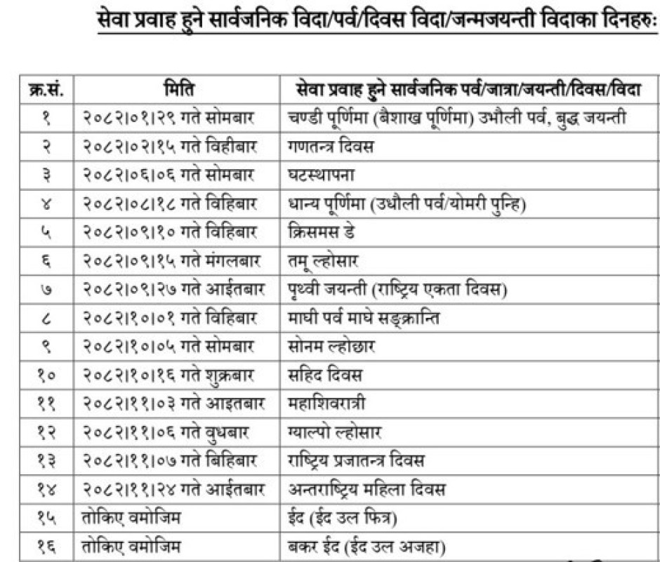 सार्वजनिक विदाको दिन सेवाप्रवाह सम्वन्धि सूचना (२०८२)